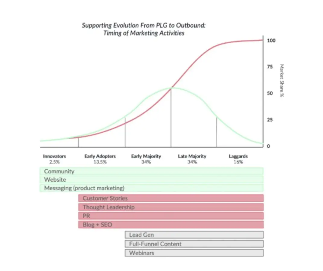 Each of these groups needs to be spoken to through marketing. However, each audience requires different channels and ways to connect. If you fail to adapt your marketing as you progress through the adoption curve, or you don’t do any marketing in the early phases, your PLG will slow down prematurely. You will have less momentum with Innovators, and Early Adopters may not come inbound at all. Moreover, Outbound Sales targeting the Early Majority will also struggle if there is no effective marketing team in place.